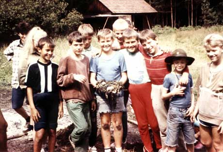 1993 Tulácký tábor u studny, výsledek vaření v Settonově hrnci (úplně vlevo instruktorka Alena, nejvíc vzadu blonďák Honza Ch, s kloboukem slavný Tulák Honza Ježek Skyva).