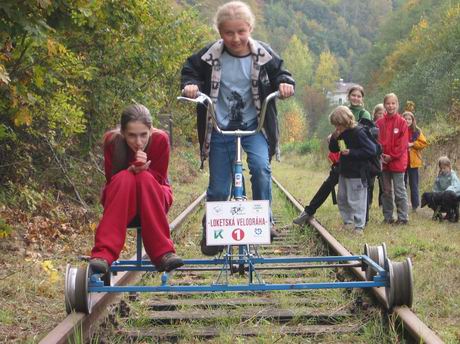 2004 Výprava do Lokte. Aneta s Hankou na speciálním kolejovém vozítku do budoucnosti.