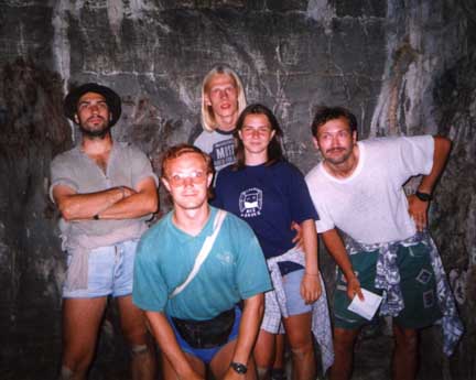Byli jsme na vandru v Moravském Krasu. Dlouhovlasý Honza Ch., vedle Káča (moje sestra), Boxer, Klimbo bez vousů a Pepa s vousy:-)