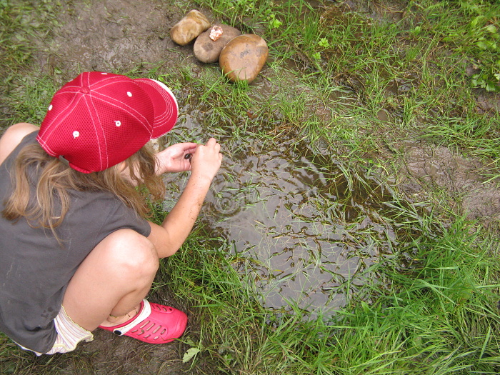 Holčičí zábava - hledání žab, jejich pojmenování a roztřídění do kaluží:-)